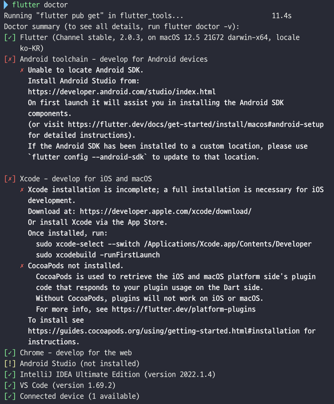 Xcode, CocoaPods, Android toolchain 의 설치가 필요하다 !