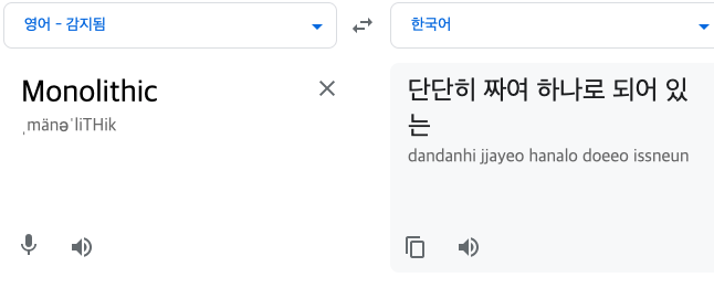 - Monolithic 의 사전적 의미는 "단단히 짜여 하나로 되어 있는"